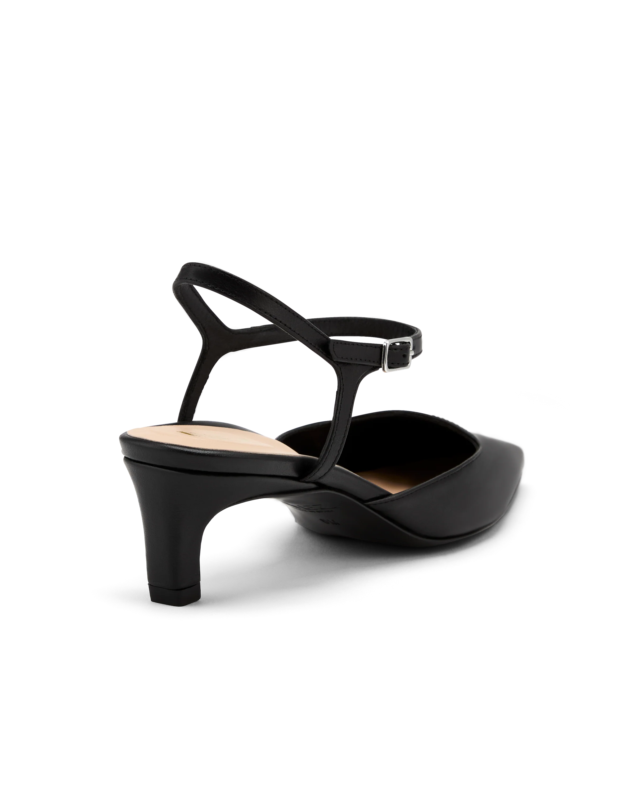 Effortlessly refined, Francesca reimagines the open-back pump through a modern lens. A snip toe and softly squared throat line create sculptural balance, anchored by posted ankle straps and a chiseled kitten heel. Finished with our signature footbed, it marries modern sophistication with lasting comfort.