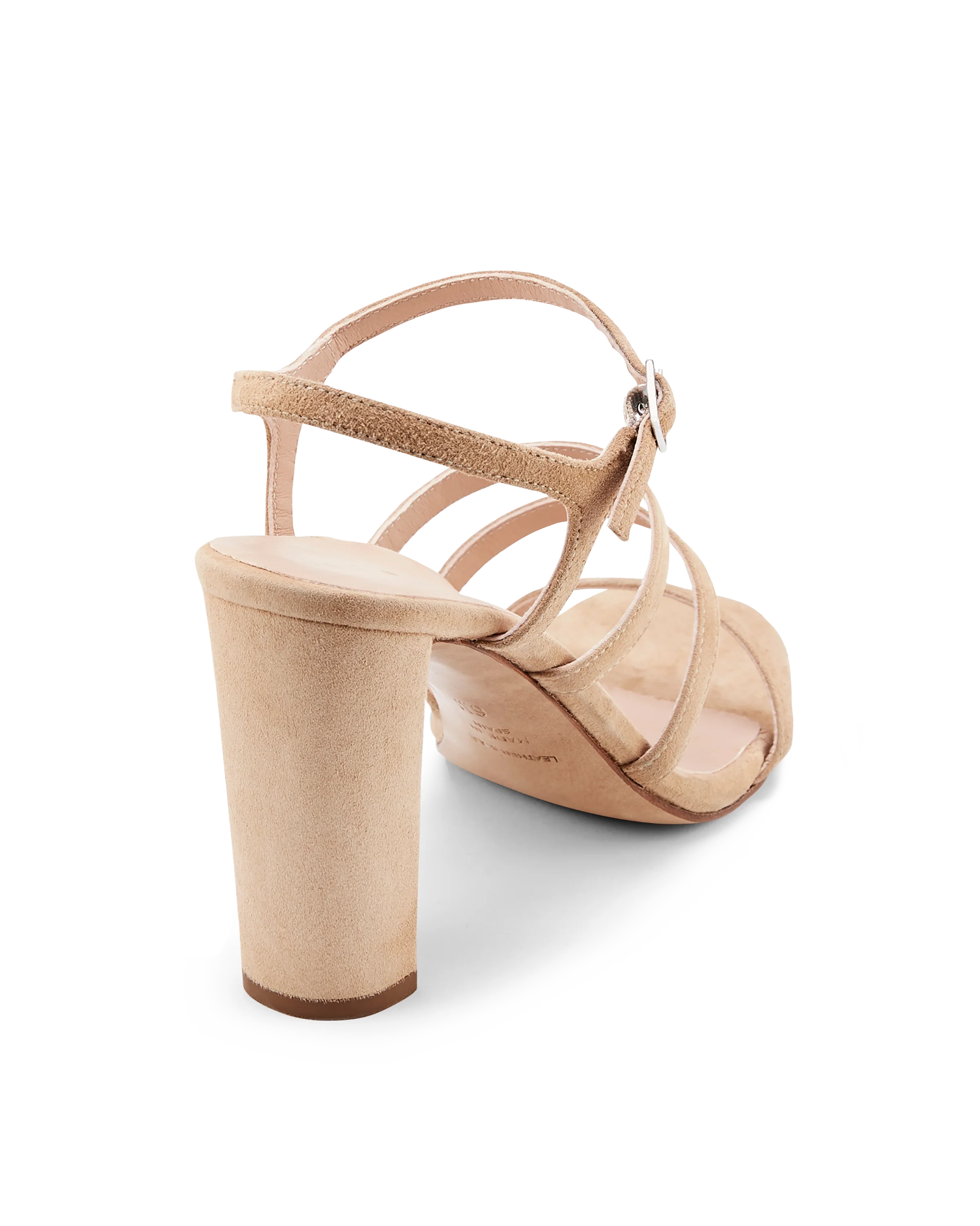 Thin, parallel straps on this high heel sandal are proportionately placed to secure the foot while providing a nearly-nude look on top of a custom-designed insole.